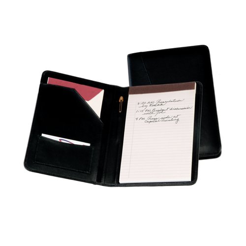 Small-scale writing Bonded leather padfolio with suede lining, interior pocket, business card holder and pen loop. Includes 5 x 8 pad. (pen not included